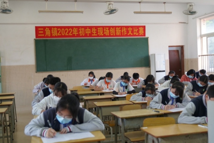 诺贝尔文学奖获得者海塞说:“没有什么比沉浸在创作的欢乐与激情中挥笔疾书更美,更令人心醉的事了。”写作的过程,是学生认真观察、主动思考、用心感悟的语文综合能力的集中体现。为培养学生创新作文能力,提高现场快速作文水平,增加创新思维和创新意识。三角中学初三年级学生参加三角镇现场创新作文大赛。