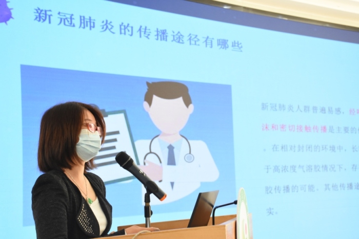 会议的第三项议程,由三角中学谭宇楹校医进行新冠病毒防控知识和技能培训,谭校医从认识新冠病毒、个人防护、健康防护知识三个方面进行讲解。谭校医提到做好健康防护尤为重要,要做到戴口罩、勤洗手、常消毒、多通风、少聚集,切实维护师生的生命安全和身体健康。