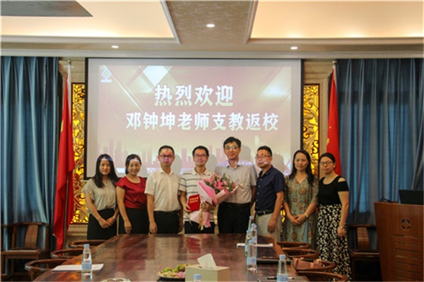 一束鲜花,一张荣誉证书,一场简单而不失诚意的欢迎仪式于7月16日在中山市纪中三鑫双语学校行政楼会议室举行。这场欢迎仪式的主人公是三鑫小学部的邓钟坤老师。2020年6月9日,按照党中央国务院、广东云南两省省委省政府的部署安排,为进一步巩固中山市三乡镇对口绥江扶贫协作工作成果,三鑫学校发出绥江支教通知。通知一发出就收到邓钟坤等十几名老师积极报名,经学校研究决定,邓钟坤作为2020年春季中山东区组团赴绥江支教的一员前往绥江支教。7月15日,邓老师支教归来,三鑫校办副主任贺敏携邓老师所在年级老师代表前往市区迎接邓老师的归来,并于7月16日为邓老师举办了简单的欢迎仪式。