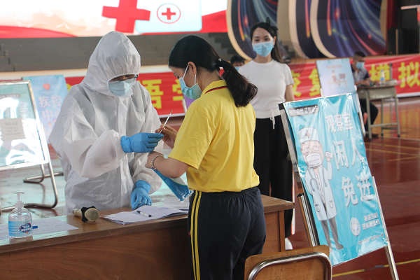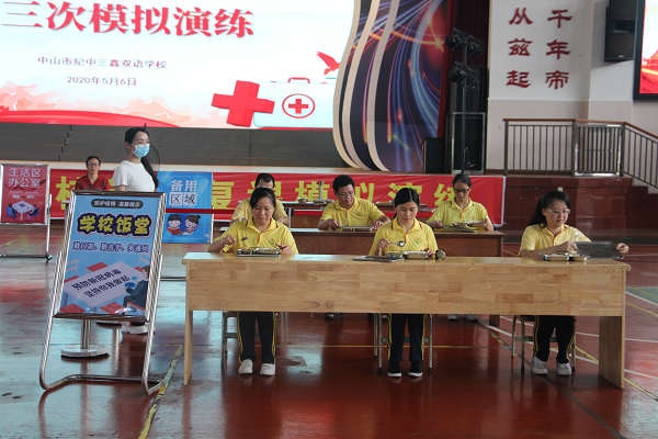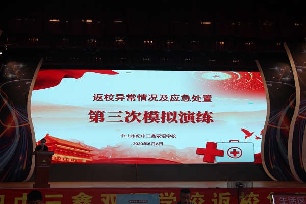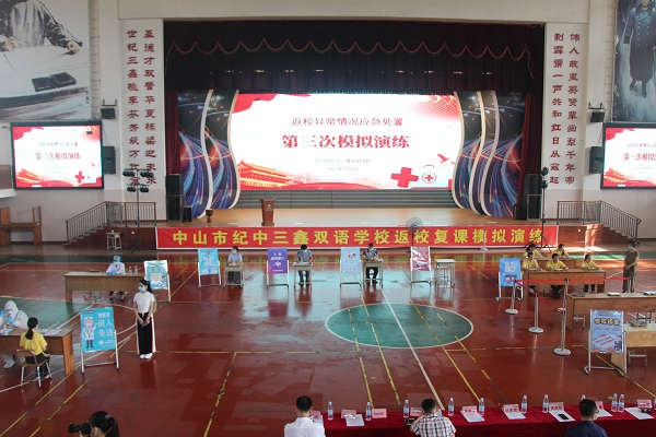 伴随着夏风习习,这个超长寒假终于慢慢走向了终点。继首批初三、高三学生返校复课之后,5月11日,初一和初二年级的同学们也将迎来复课,回到他们心心念念的教室开始正常的学习生活。为进一步提高三鑫师生疫情防控意识和疫情应急处置能力,严防疫情输入校园,确保返校复课后良好的教育教学秩序,维护师生健康和安全。5月6日下午,纪中三鑫双语学校初一、初二年级联合生活部一起在学校体育馆举行了“第二、三批学生返校复课异常情况应急处置演练”。 此次演练主要模拟的情景是“就餐中发现某学生咳嗽并检测到发热的应急处置”。