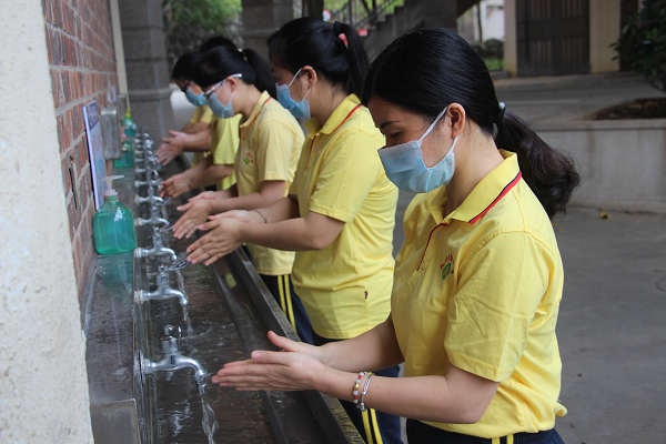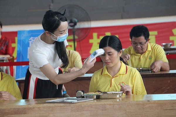 演练从餐前学生(学生由生活部老师扮演)排队洗手、进入餐厅开始。学生在进入饭堂前有序排队用“七步洗手法”洗手,然后进入餐厅隔位而坐,摘下口罩开始进餐。进餐过程中有学生咳嗽难受,生活老师发现后为该生体温检测为37.6℃,立即提醒周边同学们佩戴口罩,并通知楼长带领周边同学到备用区重新配餐、就餐。生活老师报告医务室以及生活部主管,带领该生前往留观室做详细检查。医生为该生做更进一步检查和相关询问后,将异常情况汇报给沈伟忠校长以及该生的生活老师、班主任。沈伟忠校长收到反馈信息后,向上级教育部门汇报。校医室立即向镇疾控中心报告,班主任立即向家长通报情况,校医通知总务处安排人员对餐厅进行消毒。最后,疾控部门到场处理,接学生到医院就诊。沈校长马上召集相关部门的管理人员会议,启动紧急应急处置预案。
