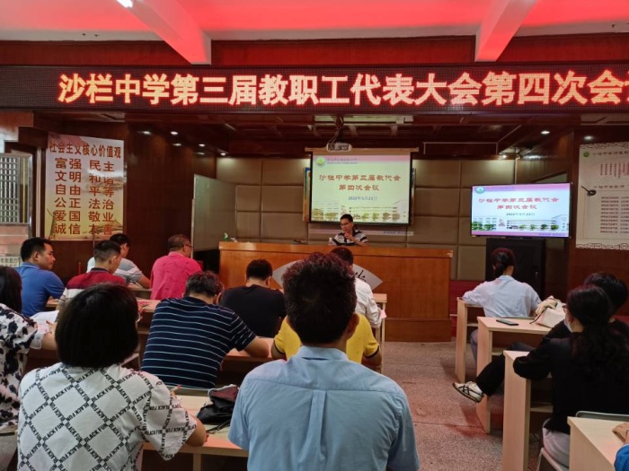 5 月 23 日上午,伴随着雄壮嘹亮的国歌声,中山市沙栏初级中学第三届教代会第四次会议在该校“和美”楼三楼会议室召开。大会由学校党总支书记、校长梁炳华主持,行政代表、级组长代表、班主任代表、科组长、备课组长、普通教师代表等31人参加了会议。
