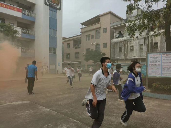 下午4点整,警铃一响,学生们迅速从防火通道口撤离。只见他们一个个表情严肃,用湿毛巾捂住口鼻,迅速而有序地从通道口撤离冒烟的“火灾”现场。楼内疏散人员按照预先的消防演习方案疏散学生,保证在楼内学生的安全,以免慌乱中出现拥挤或者意外现象。学生们逃生到操场之后,到相应的队伍排成方队,等候下一个的任务。三角镇消防大队的警官为大家讲解了灭火器的使用方法,学生们严肃认真的听着。接着,各班学生代表拿上消防器材,分批进行了实际操作,亲自体验了现场灭火的过程。这种通过实战化的演练使参加人员掌握了灭火器的使用和扑灭初起火灾的方法,取得了较好的演练效果。