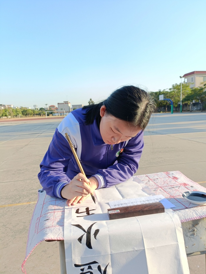 下午四点,毛笔书法现场大赛在学校操场顺利展开,参加毛笔书法大赛的学生共有四十多人,学校为参赛的选手提供了比赛用纸、用墨、碟子等用具,参赛者必须在40分钟内完成作品,不完整的作品不能参评。本次活动策划李常华、温奕灵两位老师首先向选手们发放了毛笔书法大赛的内容,备选的共有6首古诗,分别用简体和繁体印刷。主持人卢富生副主任介绍了活动主题、比赛规则后,比赛正式开始。选手们仔细思考,选材、折纸,全神贯注于作品的书写中,一丝不苟,点横撇捺,工整美观,尽力表现出自己的最高水平,一张张纸上呈现出参赛学生的深厚书写功底。同学们个个聚精会神,沉着冷静,楷书、行书、篆书等笔画有力,一个个清秀、工整的汉字充分展示了学生们良好的素质和对传统文化的热爱。