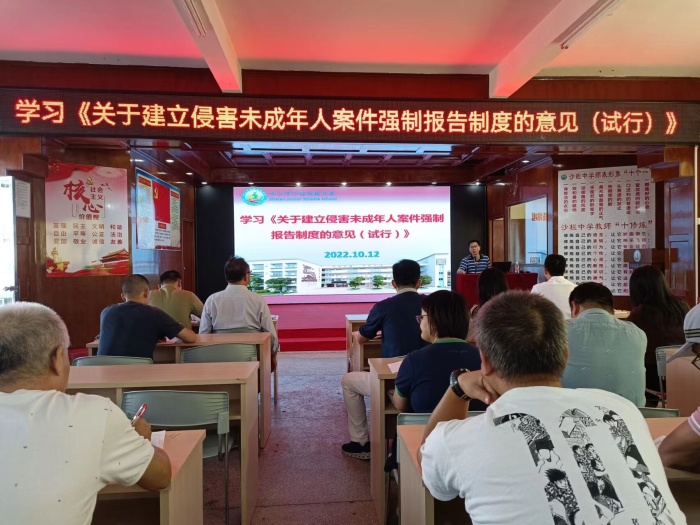 会议的第二部分是梁炳华校长带领全体教师详细解读《关于建立侵害未成年人案件强制报告制度的意见(试行)》的通知。国家机关、法律法规授权行使公权力的各类组织及法律规定的公职人员,密切接触未成年人行业的各类组织及其从业人员,在工作中发现未成年人遭受或者疑似遭受不法侵害以及面临不法侵害危险的,应当立即向公安机关报案或举报。而中小学校属于与未成年人密切接触的企事业单位,每个教师需时刻谨记未成年人强制报告制度的相关内容,发现未成年人身心健康受到侵害、疑似受到侵害或者面临其他危险情形时及时如实上报,保护未成年人的安全和合法权益。