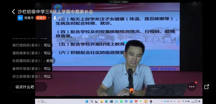 光阴似箭,日月如梭,转眼间学期已过半。为了加强学校、教师与家长之间的联系,增进每一位家长对学校工作及孩子在校学习情况的了解,更好地达到家校携手、共育孩子美好未来的目标,沙栏中学于2022年11月18日晚分级分班召开了线上家长会。