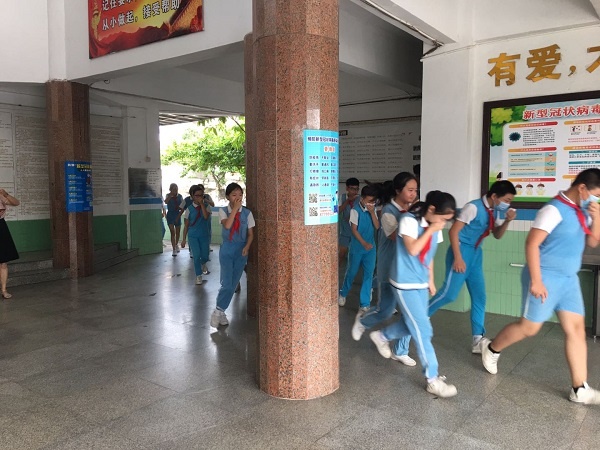 8:10分演练准时开始,在急促的警报声中,各楼层、走廊负责的老师以最快的速度到达所在的岗位,各班学生在老师有序的组织下,按本班疏散路线迅速有序撤离。在疏散过程中同学们用毛巾轻捂口鼻,低头弯腰靠右侧快步下楼,撤离有序,行动迅速,没有奔跑冲撞,同学之间也没有推拉喧哗、拥挤踩踏。到达指定位置后,各班迅速整队,教师清点人数后,统一向上汇报。