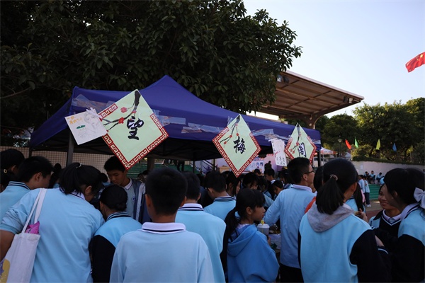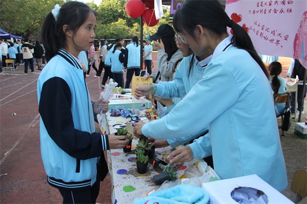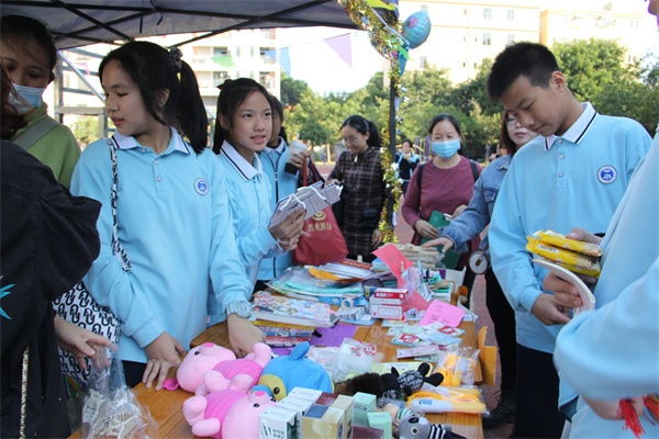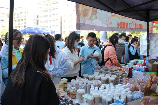 本次活动一共设置25个摊位,分为两个年级,初一年级主要营销精品,初二年级主要营销食品。这次活动全体师生积极参与,不少热心家长也到场支持。下午的阳光格外明媚,整个田径场成了一个热闹的大集市。各班在摊位布置、气氛营造、商品出售诸方面都绞尽脑汁,吸引客流。