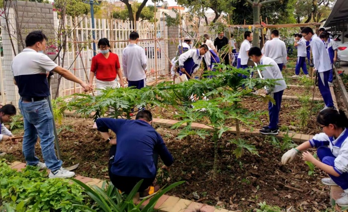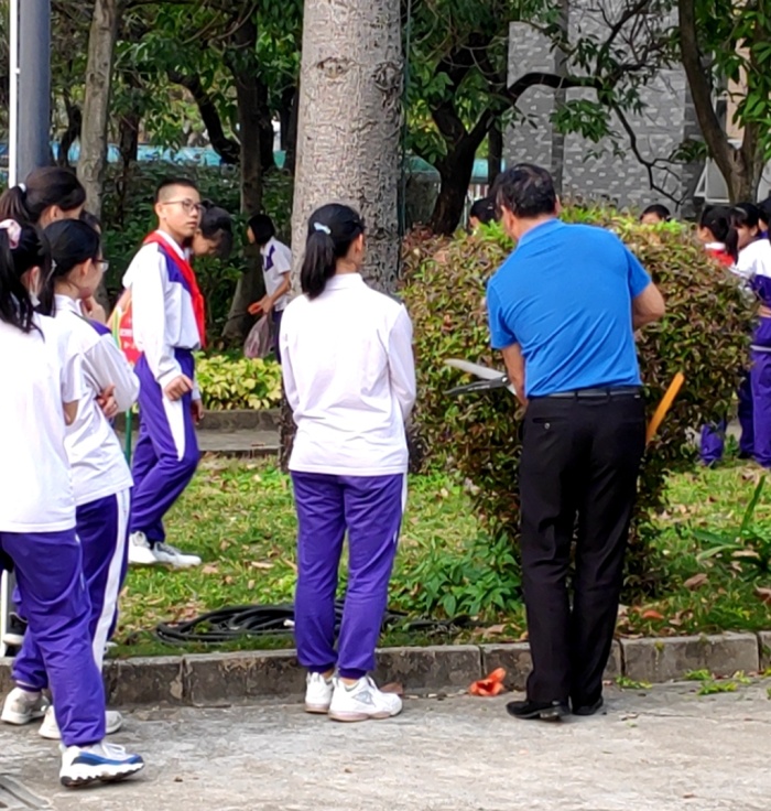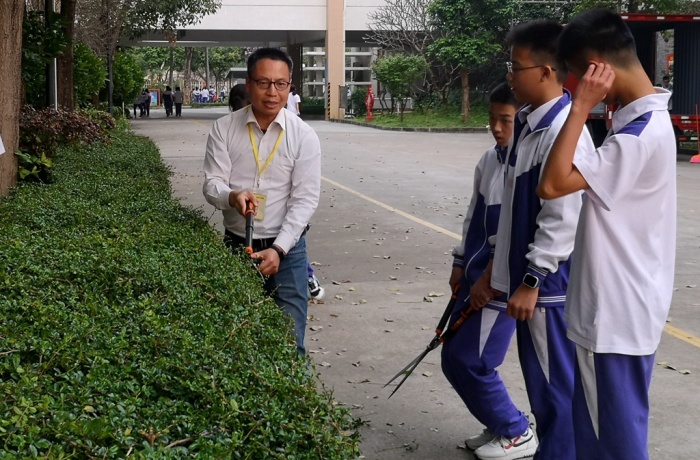 在校园的园艺基地,钟敏老师、黄小平主任、戴放良主任给参加园艺课程的学生做示范,如何用园艺专用剪刀修剪校园花木和绿化带。钟敏老师是一名体育老师,也特别精通种植,操作起园艺剪非常有讲究而且很熟练,学生们对园艺课程很喜欢,很感兴趣。虽然修剪起来有点难度,很辛苦,满脸是汗水,但他们很主动,爱体验,脸上带着快乐的笑容。
