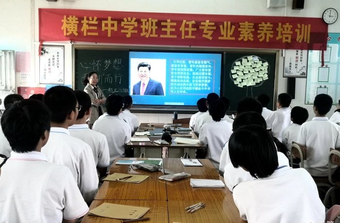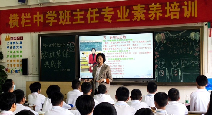 当天下午,永宁中学全体班主任分年级进班观摩了横栏中学举办的班主任专业素养培训的主题班会,分别有初一(16)班《我和班级共成长》、初二(19)班《静待花开》、初三(5)班《理想前途教育》的主题班会活动,主题班会是根据三个年级学生的不同特点而开展的,三节班会课以“三迈”行动为主线,以“体验”教育为抓手,向观摩老师展示了该校初一级迈好中学第一步、初二级迈好青春第一步、初三级迈好理想第一步的“三迈行动”德育体系。内容非常符合学生的年龄特点,针对性强,切合实际,形式多样,学生积极参与体验和分享,触动学生心灵,教育效果非常好,也体现了上课班主任扎实的专业素养和高超的育人能力,为永宁中学班主任进行主题德育教育活动提供了示范,课堂上学生有礼、自信、大方的表现,给老师们留下了深刻的印象。