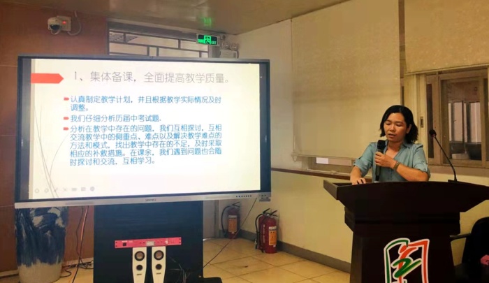 钟斌老师作为班主任代表,给老师们作了题为《中考复习的关键——合作共赢》的经验分享。在刚刚过去的这一学年当中,钟老师所带班级取得了中考A类总分全校第一的好成绩。钟老师主要从科研团队建设、班级团队建设、理想激励教育等方面分享自己的班主任工作经验。作为资深班主任,钟老师带班经验丰富,发言生动幽默,在场教师纷纷给予热烈掌声。