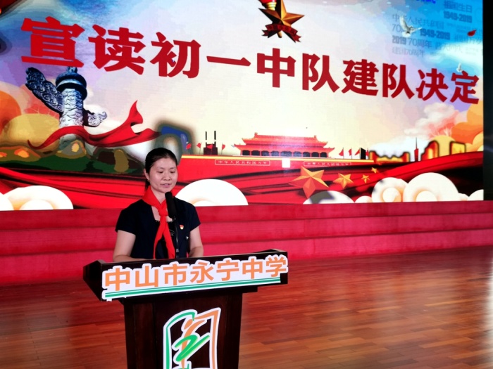 大会在雄壮的国歌声中拉开帷幕。首先,由大队辅导员罗结晶副主任宣布初一年级建队决定和中队辅导员名单,并由陈清茂校长、陈华梁副校长、杨青华副校长为中队辅导员授中队旗并颁发聘书。