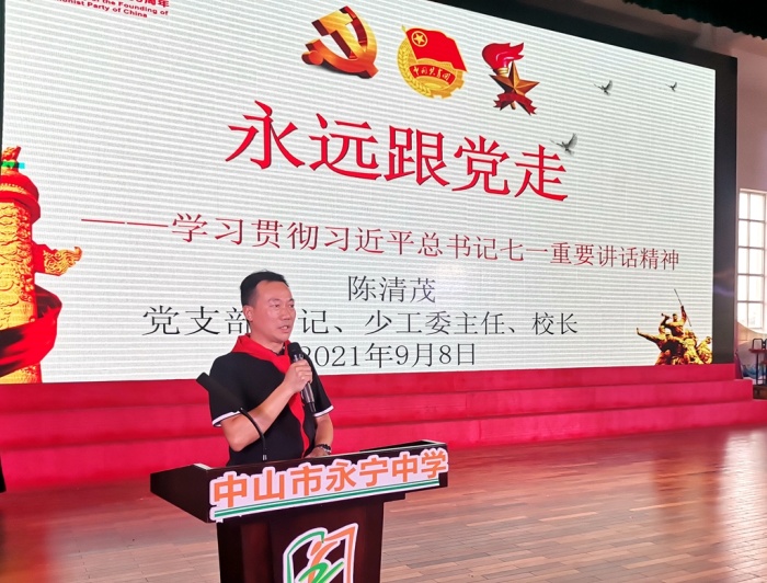 第三议程,由永宁中学少工委主任陈清茂校长作少先队开学第一课《永远跟党走》。陈校长从兴国、富国、强国三个时期讲述了中国共产党在实现中华民族伟大复兴进程中取得的伟大成就;总结了实现中华民族伟大复兴必须坚持的成功经验,解读中国共产党的成功密码;他激励少先队员们在新时代,要牢记殷切希望,勇担历史使命,立志做一个有理想、有志向、有追求、有责任感、有奉献精神的接班人。