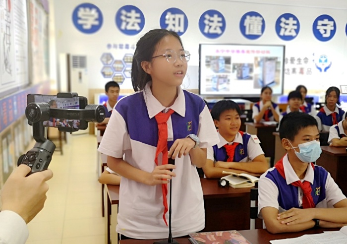 永宁中学学生认真观摩、思考,模拟庭审结束后,踊跃向模拟法庭提出相关法律问题,模拟法庭的成员一一作了回答,为现场学生们释疑,并教育学生们要学会自我保护,遵纪守法,向校园霸凌说“不”,拒绝为犯罪行为提供帮助。庭后,“审判长”许勇律师接受了媒体记者的采访。