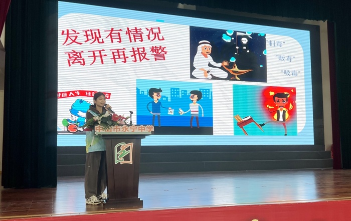 最后,永宁派出所张祥源警官组织全体学生进行禁毒庄严宣誓,表达了禁毒决心,为同学们敲响识毒、防毒、拒毒的警钟。戴放良主任号召全体师生,不但自己要珍爱生命,拒绝毒品,还要将所学的禁毒知识宣传给自己的家人、朋友和邻居,做一名禁毒志愿者、宣传员,共同为创建“无毒社区”贡献自己的力量。