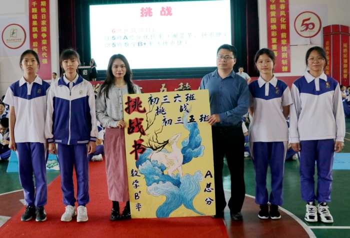 第二篇章,少年强。各班分别向其他班发起挑战,宣读挑战书,台上台下都充满不服输的热烈竞争气氛,气势十足。班级代表们霸气十足的发言,彰显了同学们冲刺中考的信心和勇气,现场掌声和喝彩声不断。