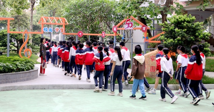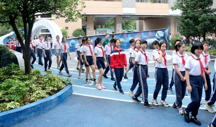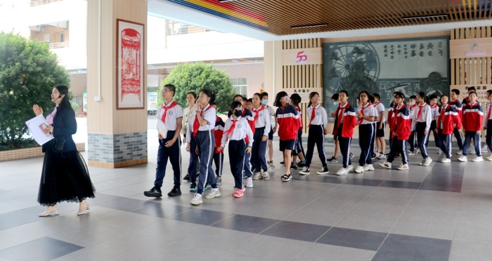 本次衔接活动在参观永宁中学校园中拉开序幕。永康小学六年级全体同学在吕惠贞校长、叶凌燕主任、各班正副班主任带领下,佩戴着鲜艳的红领巾,怀着激动的心情,排着整齐的队伍来到了永宁中学,在永宁中学陈清茂校长、戴放良主任、罗结晶副主任、梁红华老师、欧光轩老师的引领下,兴致勃勃地参观了永中美丽的校园。近距离感受永宁中学温馨优美的学习环境和浓厚独特的文化氛围。来访的师生们在罗结晶副主任的介绍下饶有兴趣地参观了党建文化长廊、孔子文化长廊、科技艺术园、菊花文化园、美丽园、家园、慧明亭、志愿文化园、校园书吧、运动场、篮球场等校园教育阵地,深入感受到了浓浓育人的校园文化和现代化教育教学设备设施,纷纷赞叹不已。