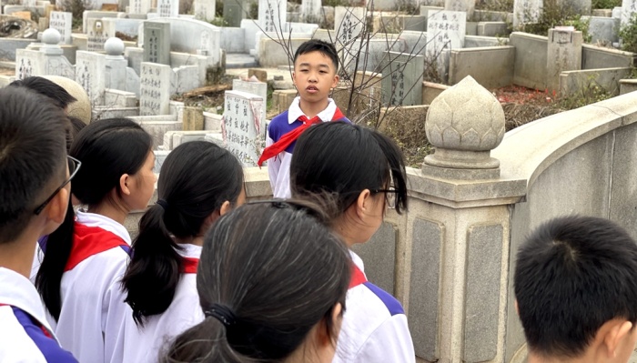 全体师生排着整齐的队伍,依次将纸花摆放在先贤墓前,并深深鞠躬,表达对先贤的敬意与思念。红色基因宣讲员孔德树、陈琳分别代表学生表达了对先人的崇敬和哀思,号召全体少先队员用先贤的崇高理想、伟大精神来净化心灵、提升境界,把内心激荡的爱国之情、报国之志化作刻苦学习、勇攀高峰的不懈动力和实际行动。接着,全体党员、团员、少先队员们在墓前庄严宣誓,承诺努力学习和弘扬先辈的爱国爱乡精神,从现在做起,从身边小事做起,力争为祖国、为人民,为家乡贡献自己的力量。