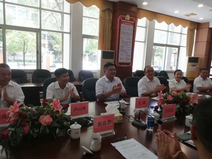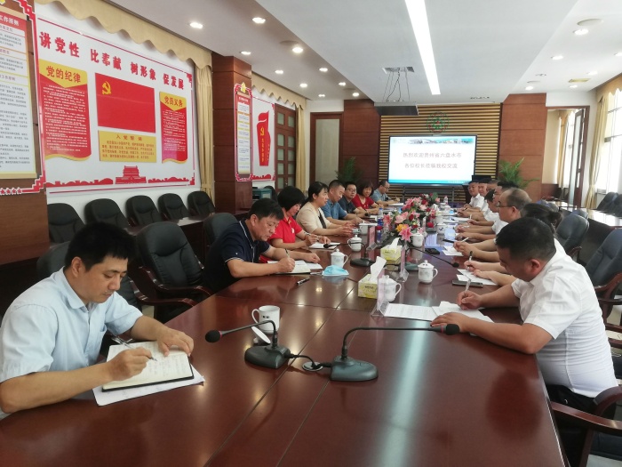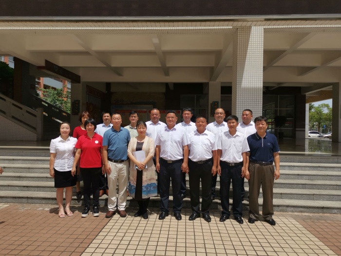 按照国家新一轮东西部协作工作部署,为落实《广东省中山市 贵州省六盘水市对口帮扶教育协作协议》等文件有关要求,六盘水市选派了16位初中校长前来中山市跟岗交流。六盘水市16名校长分为A组和B组。B组一行8人为期半个月在云衢中学的跟岗交流结束后,A组一行8人于6月24日上午来到云衢中学进行为期半个月的跟岗交流,受到云衢中学彭柳芳校长等行政老师的热情接待。当天适逢市教体局王志红副局长到校检查中考准备工作,王局长得知六盘水市校长一行到校后,随即一起参加接待会议。