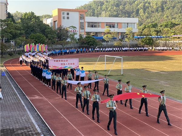 伴随着激昂的《运动员进行曲》,国旗班、鲜花队、彩旗队、裁判员队、云衢中学各班方队精神饱满,昂首挺胸,迈着矫健的步伐,依次进入田径运动场。