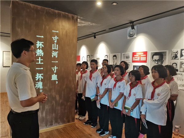 “一寸山河一寸血,一抔热土一抔魂。”少先队员们步入中山抗日游击大队展厅,映入眼帘的豪情壮语勾起了那段充满血与泪的十四年抗日战争历史。少先队员们参观展厅,在南朗镇中学共青团名师工作室成员、云衢中学历史高级教师叶国应老师的讲解下,认真学习了抗日战争历史和中山抗日游击大队光荣历史,深刻领会抗日战争胜利的艰苦卓绝和重大意义,缅怀先辈,继承革命传统。