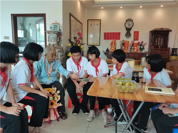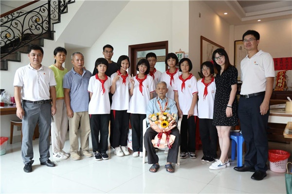 随后,镇团委副书记梁建辉、云衢中学团委书记范斌斌和7名优秀少先队员代表拜访了抗日老战士黄彬权,听他讲述那段不畏强敌、英勇抗战的故事。少先队员们听抗战故事,看着老照片,对眼前老战士的尊敬和敬佩油然而生,现场送上献花和亲手制作的心意卡,祝福健康长寿。