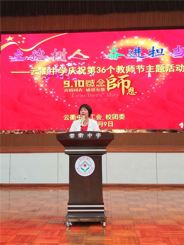 活动开始前,教职工观看了专题短片《倾情雪域》,了解包括学校彭芸芳老师在内的中山市援藏教师先进事迹,感受他们大爱无疆、乐于奉献的师者仁心。接着,由彭柳芳校长致节日祝词,彭校长在致辞中传达了习近平总书记对广大教师的重要寄语精神,以及中山市委赖泽华书记和南朗镇党委副书记、镇长许行等市镇领导到学校教师进行节日慰问的寄语精神。彭校长提到,南朗镇党委政府非常重视教育发展,在镇党委政府的关心支持下,云衢中学逐步发展为南朗镇乃至中山市办学的一个窗口和名片,这离不开学校全体教职员工长期的努力和付出。同时彭校长还对全体教职员工寄以了节日的问候和祝福。