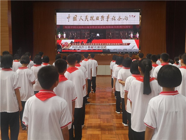 接着同学们观看了学习强国视频短片,上午10点全场肃立,向在中国人民抗日战争中英勇牺牲的烈士默哀。默哀毕,初一年级全体师生共同观看献花仪式的直播,14名礼兵抬起7个花篮,缓缓走进中国人民抗日战争纪念馆序厅,将花篮摆放在象征中华民族团结抗战的大型浮雕《铜墙铁壁》前,习近平主席等缓步登上台阶,走进纪念馆序厅,在花篮前驻足凝视。火红挺拔的花烛、缤纷绽放的兰花、芬芳吐蕊的百合,寄托着对抗战烈士的深切缅怀和崇高敬意。
