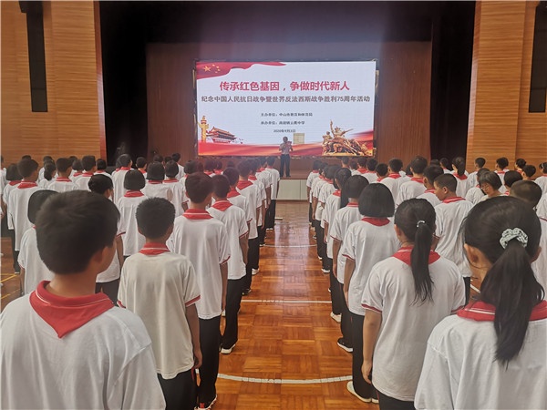 2020年9月3日迎来纪念中国人民抗日战争胜利暨世界反法西斯战争胜利75周年,为进一步弘扬以爱国主义为核心的伟大民族精神,缅怀在中国人民抗日战争中英勇献身的英烈,激励学生铭记抗战历史,传承革命精神,珍惜美好生活,奋发图强,有所作为,为实现中华民族伟大复兴的中国梦而努力奋斗,在中山市教育和体育局以及南朗镇教育事务指导中心的指导下,云衢中学德育处与团委联合开展“传承红色基因,争做时代新人”纪念中国人民抗日战争暨世界反法西斯战争胜利75周年活动。此次活动由该校团委副书记杨勇主持。