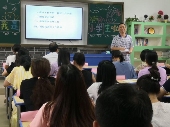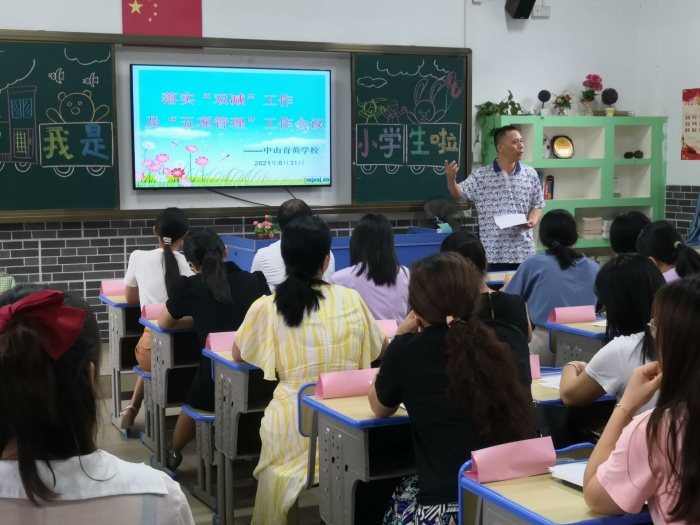 为推进中央“双减”工作和教育部“五项管理”工作落到实处,促进学生全面发展、健康成长,2021年8月31日,中山市育英学校在一(3)班教室召开落实“双减”及“五项管理”工作会议,会议由董湘钧副校长主持,全体教师参加会议。