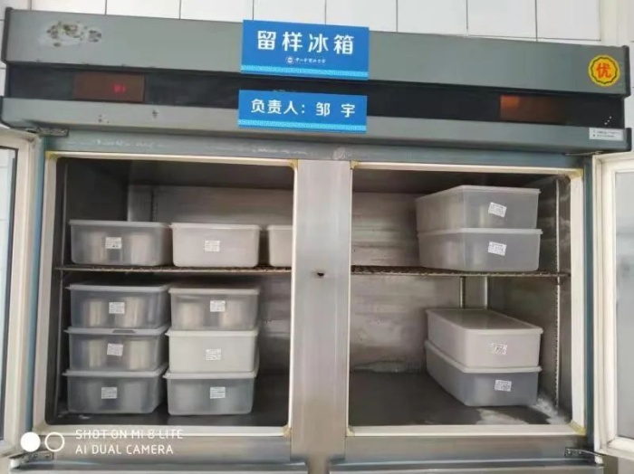 严把食品留样、原料存储关。食堂食品做到留样规范,标示出所留样食品的品名、留样时间、留样数量、留样人,并做到专人、专管、专锁。切实做好食材储存工作,在存储时做到环境干净、卫生;存储温度符合食品存放要求等。