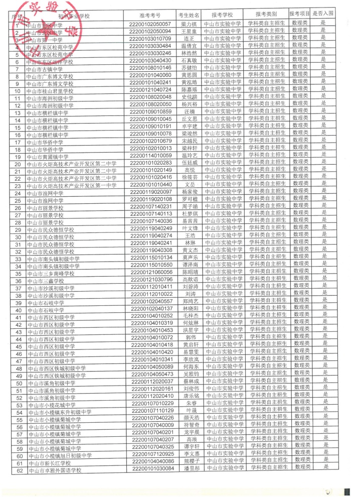 附件:中山市实验中学2022年“小平科技创新班”学科类自主招生学校考核入围名单