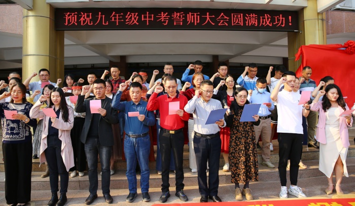 教师宣誓中,卓雅外校党支部书记龙起达、校长李雄杰与九年级全体教师共同宣誓,催人奋进的誓词让九年级的同学对中考充满信心。