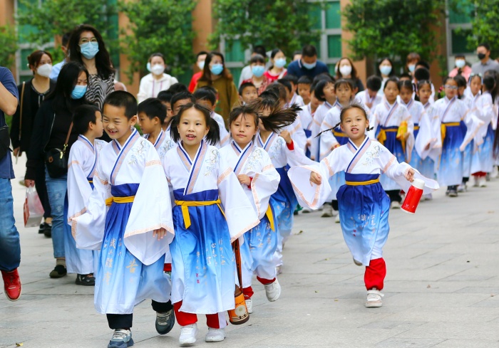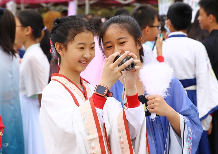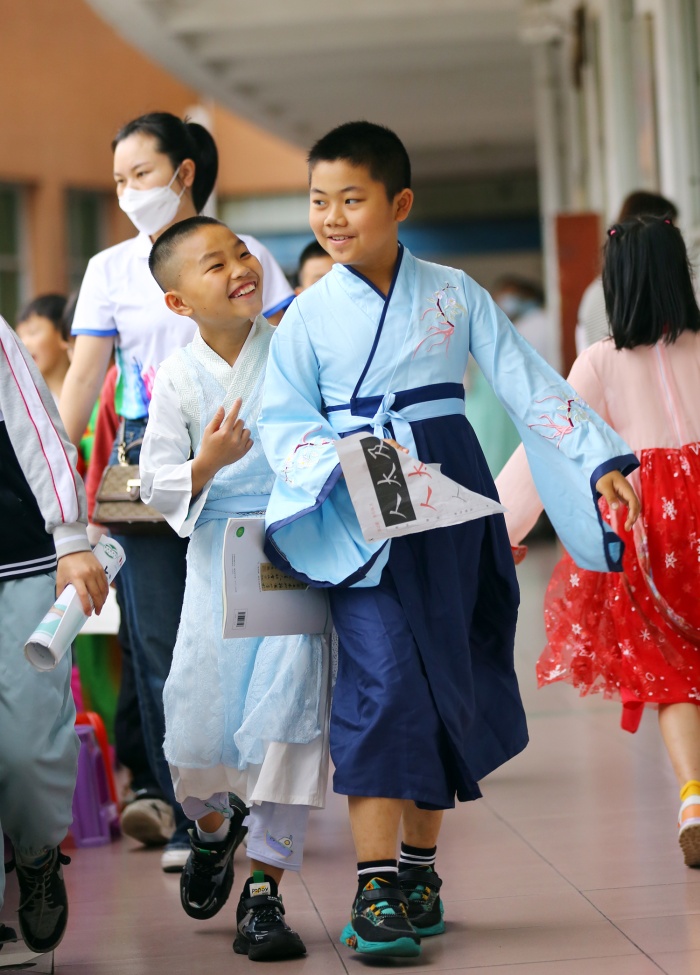 大课间,家长们来到操场,观看“课外阅读校本课程成果展示”,同学们身着汉服盛装出席,手持折扇风度翩翩,以情景剧、歌舞表演、手语操、诗歌朗诵等形式,再现西游记、千字文、鲁滨逊漂流记等中外名著名篇的精彩内容,小学部还邀请家长身着传统服饰参与到茶艺表演中,与同学们一起感受优秀的中国传统文化。