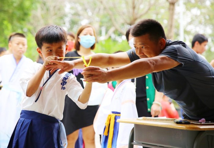 在第二届传统文化暨读书节展示活动中,一二三年级的同学们表演了课本剧《荷叶圆圆》,一同齐诵《弟子规》、汉乐府诗歌《江南》,在优美的古诗词中感受阅读的乐趣。展示活动后,同学们与爸爸妈妈一起参与到游园活动中,“甲骨文里寻始祖”“脑筋运转谜底见”“你演我猜合作乐”“汉字啄木鸟”“正中靶心”等游戏摊位前排满了摩拳擦掌的小朋友。“各类小游戏基本上都和传统文化有关联,踢毽子、射箭、打陀螺、踩高跷等等,孩子们穿着漂亮的传统服饰跑来跑去热情参与,我感受到了他们的快乐。”一年级林子阳的爸爸说,卓雅“活动育人”的理念在开放日活动中有了很好的体现,同学们在收获快乐的同时也学到了知识。