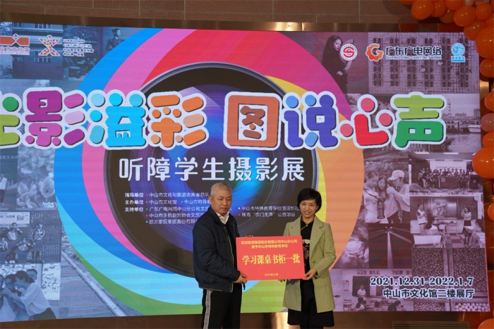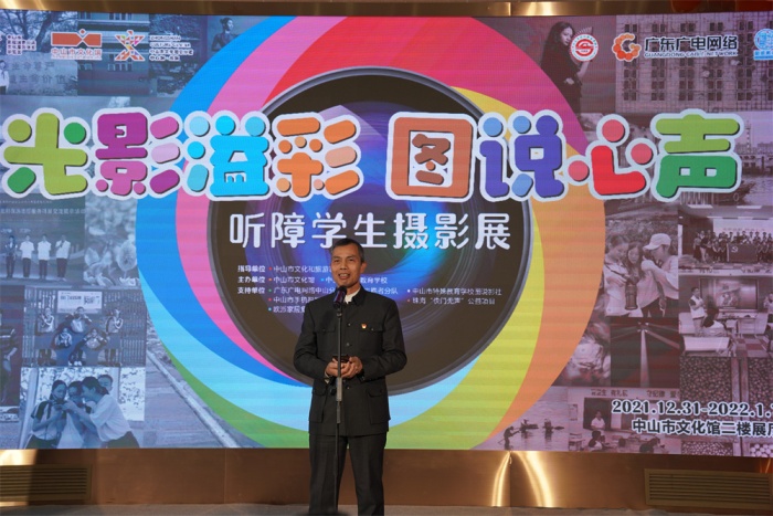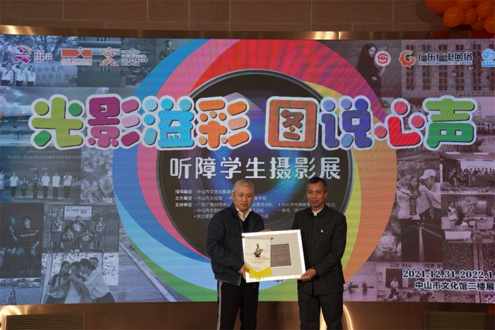颁牌仪式上,中山市文化馆为支持单位广东广电网络中山市分公司授予感谢匾牌,欧派家居集团股份有限公司中山分公司为市特校捐赠课桌椅一批。随后,引领听障孩子入门的珠海“快门无声”公益项目创始人朱习女士对孩子们的成长表示惊喜和欣慰,“光影溢彩 图说心声”听障学生摄影培训项目负责人、本次摄影展主要策展人之一贺亿强先生表达了自己的感谢与激动,并对听障孩子今后摄影学习作了详细规划。活动中,嘉宾与学生代表共同为本次开幕式剪彩,接着嘉宾们一同步入展区,静心赏鉴听障孩子们用眼睛“听到”的世界,用镜头记录的生活,为明媚绽放的生命之光点赞!