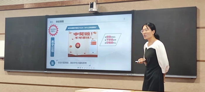 朱丽庆老师凭借扎实的专业技能完成上机实操。在说课和答辩环节,以《双色球大揭密——有趣的Mind+编程应用》为主题展开,巧妙地将生活中常见的中奖游戏融入到教学中,将学科教学与德育有机结合,帮助学生树立正确的人生观和价值观,破解彩票中奖的秘密,提醒学生不要投机取巧,避免有不劳而获的思想,应该通过自己的努力实现梦想。朱老师的选题立意新颖,述评深刻,给现场评委留下了深刻印象。