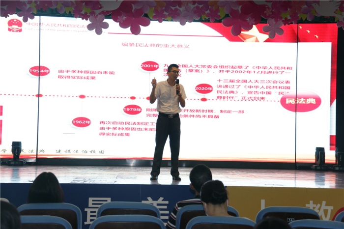 为深入宣传和学习《中华人民共和国民法典》,营造普法、知法、学法、守法、用法的浓厚氛围,进一步提高教师学法、懂法、用法的法治意识,9月25日下午,中山特校邀请广东金桥百信(中山)律师事务所张龙律师来校,面向全体教师开展《民法典》专题解读普法讲座。