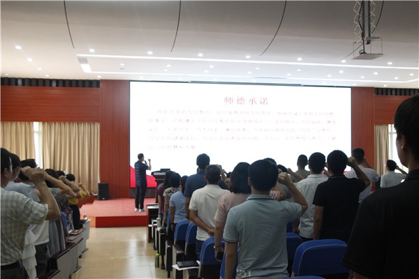 会上,全体教职工在校党总支副书记、副校长章利建带领下进行师德师风建设宣誓。校党总支纪检委员郭冬冬带领大家重温了《关于全面深化新时代教师队伍建设改革的意见》等文件精神,要求大家务必加强组织纪律、工作纪律、生活纪律,按照“自律”、“规范”的要求做更好的自己。