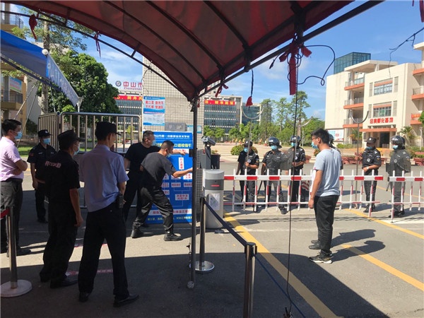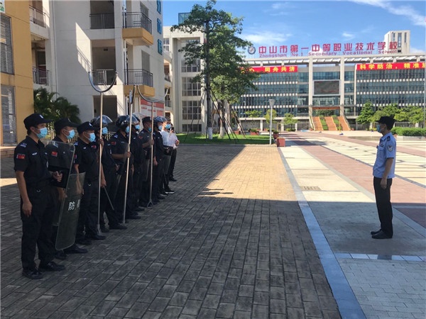 为了使保安人员熟练掌握安保器械,提高应对突发事件的应急处置能力,6月11日上午,中山一职开展校门安保突发事件应急处置演练。冯华彬副校长、学生处刘基主任和蔡权副主任、物业公司梁启文经理及全体保安员参加了演练活动,学校驻校民警罗承志警官到现场进行演练培训指导。