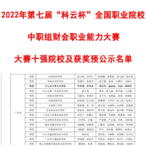 为进一步提升会计人才质量,提高学生的实践能力、就业能力和创新能力,适应大智移云技术在财务领域的快速应用,由中国商业会计学会主办、厦门科云信息科技有限公司承办的2022年“科云杯”全国职业院校中职组财会职业能力大赛于2022年5月21日成功举办。自开赛以来,经过校内赛的激烈选拔,全国超两百所学校、362支队伍报名参赛。由现代服务业部邓芙蓉、彭凤琼两位老师指导的代表队在全国370支队伍中荣获一等奖的好成绩。
