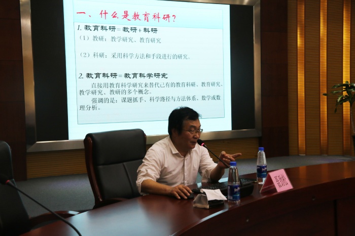 理论源于实践,理论指导实践。对理论的深刻把握有利于课题研究绽放创新之花结出教育科研之硕果。聂劲松以《教育科研及其方法论问题》为主题,他高屋建瓴,从什么是教育科研、为什么要做教育科研、怎样做教育科研、课题申报书准备四个大的方面展开,引导在座教师在教育科研中要以问题导向为原则,与在座教师分析教育科研的内涵、教育科研的目的和意义,进而梳理出教育科研的问题源泉,明确教育科研启动与实施的过程,引领大家把握选题角度,研究价值表述的准确性贴切性,理顺研究目标、研究内容以及之间的科学逻辑关系。