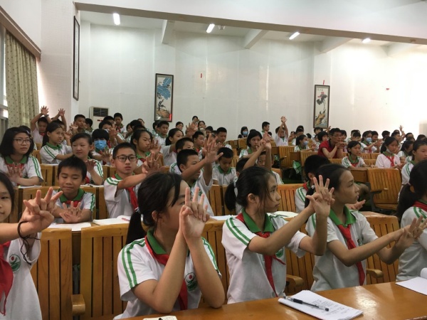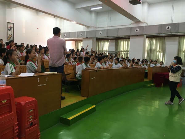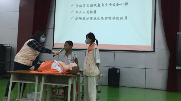 为全面普及应急救护常识,增强广大师生对心脏骤停、烧烫伤、溺水、出血等突发意外伤害事故的认知和提升广大师生的自救互救技能,2020年7月6日下午,三角镇中心小学邀请中山市红十字会、三角镇红十字会工作人员走进校园,举办“中山市红十字会、三角镇红十字会应急救护培训讲座”。担任本次活动的主讲嘉宾是红十字会工作人员黎子丹老师,红十字会工作人员黄美琪老师协助培训活动,参加本次培训活动的是三角镇中心小学五年级全体师生。