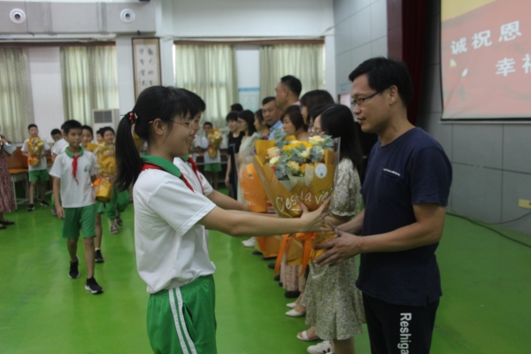 最后,同学们为学校大家长及六年级的老师们送上鲜花将毕业典礼推向高潮,师生互动,生生互动,整个会场成了情的海洋。同学们向老师赠送了亲手制作的贺卡,表达了对老师的感恩之情。同时各位领导、教师为学生们送上饱含真情的祝福,毕业典礼在音乐《感恩的心》中落下了帷幕。