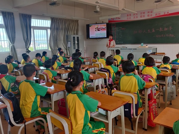 队会课上,各中队辅导员先组织学生观看视频《扣好人生的第一粒扣子》,让队员明白“扣好人生第一粒扣子”的重要性,理解人生的“扣子”从一开始就要“扣好”的道理,知道了作为学生应该如何“扣好人生的第一粒扣子”。然后通过老师对课件进行讲解,让学生根据社会主义核心价值观对照日常行为,正视自身不足,从日常的行为规范中谈该如何践行社会主义核心价值观。队员们积极举手,踊跃发言,敢于剖析不足,勇于改变,将社会主义核心价值观内化于心,实践于行,增强自我约束能力,努力改正不良习惯,做一个文明的学生,做一个有道德的人。