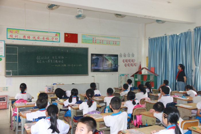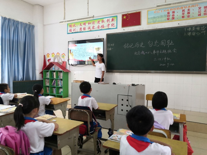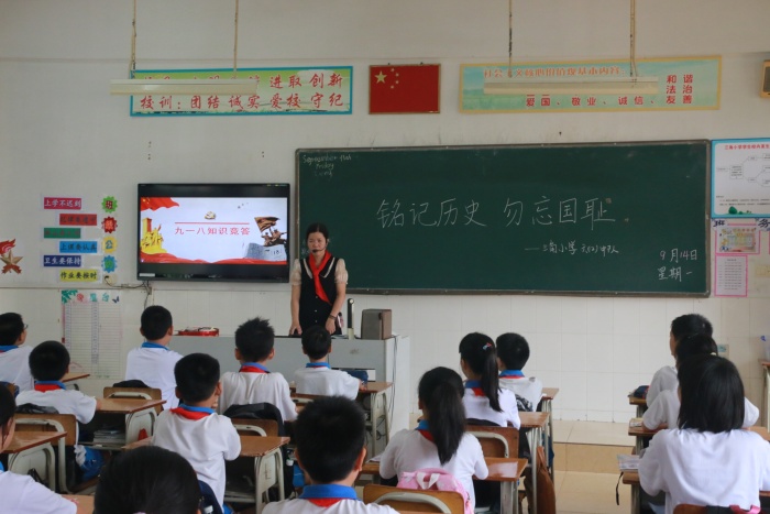 在队会课上,老师们语气沉重地讲述九一八事变的起因经过和历史背景,并播放了还原九一八事变当晚历程的视频。随后,老师们向学生展示了一幅幅浸透血泪的历史图片,深重的民族苦难使人动容,使人难忘;介绍了一位位身先士卒,为国牺牲的革命先烈——杨靖宇、赵尚志、王光宇、王德泰、赵一曼、马占山,致敬英雄,追念英灵;讲述了以冷云为首的东北抗日联军8名女官兵与日伪军展开激战,誓死不降,而后集体沉江,壮烈殉国的故事。学生们还进行了九一八知识竞答,将民族的苦难记忆和伟大的爱国精神、不屈的抗争斗志永记心间。