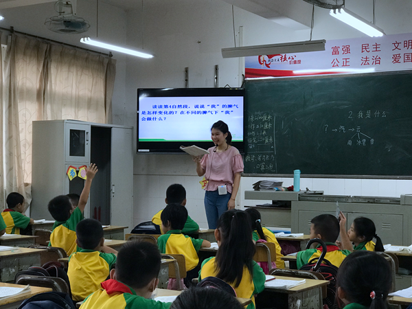 欧阳佩君老师执教一年级《对韵歌》,教学仪态从容,娓娓道来,课堂纪律井然有序,让学生在轻松的氛围中识字学文;并采用教师范读、学生齐读、小组朗读等形式,带领孩子们吟诵古诗,体会汉语的韵律美。