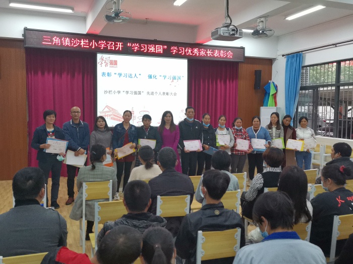 本学期,为了响应党中央的号召,沙栏小学“学习强国”学习活动开展如火如荼,不仅全体教师天天学习,全体家长也加入了这个“学习强国”学习的行列。为了巩固前阶段的学习成果,也为了进一步推广“学习强国”学习活动,扩大其在全社会的影响,12月10日下午,沙栏小学继续召开“学习强国”学习先进家长表彰大会,值此机会,表彰了从9月1日到12月9日在学习强国活动中表现突出的五年级家长,五年级全体教师和家长参加了此次大会。