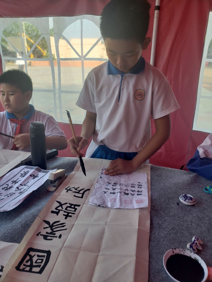 比赛当天,三角小学林海宜和陈姻伊两位美术老师带领学生前往比赛现场——三角文化广场参赛,同学们斗志昂扬、充满自信地迎接挑战。赛场上,同学们精神抖擞,立定心志,握笔正确,坐姿端正,表现出良好的书写习惯,所写的作品笔画流畅。楷书横平竖直,结构匀称;隶书整体美观,游刃有余。同学们在规定时间内完成了自己较为满意的书法作品。