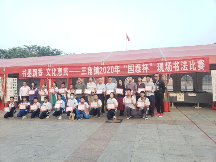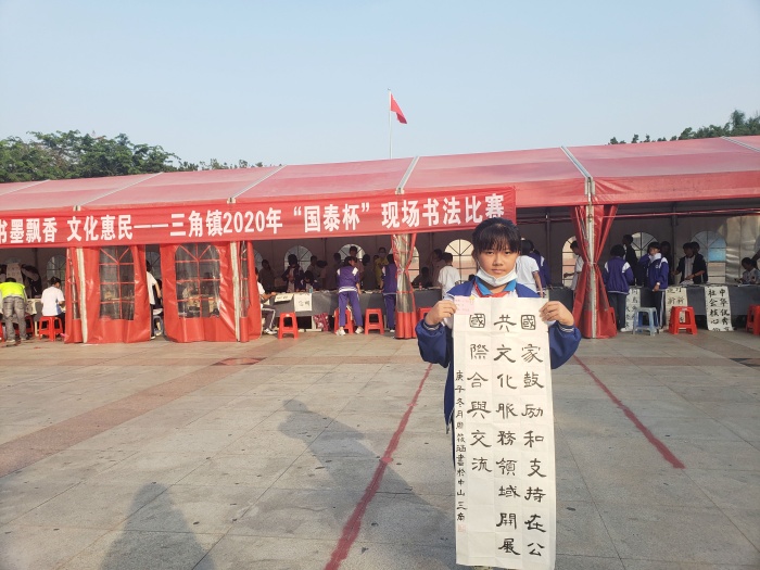 为统筹推进文化建设,丰富群众业余文化生活,三角镇面向社会各界和全镇中小学师生,于11月24日下午3:00在三角镇文化广场举行了一场别开生面的2020年“国泰杯”书法比赛。三角镇三角小学吴俊汶、周筱涵等9名学生代表参加了本次活动。